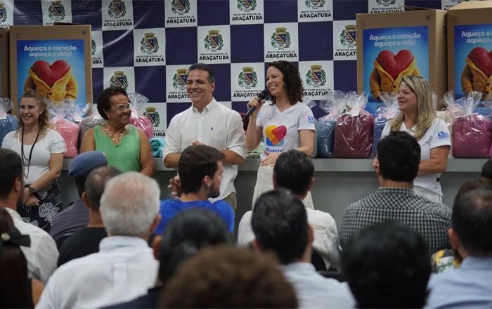 A Prefeitura de Araçatuba, por meio do Fundo Social de Solidariedade (FSS), lançou a Campanha do Agasalho 2025, em solenidade realizada na última quarta-feira (02), no Salão Azul do Paço Municipal. Durante o evento, houve entrega de cobertores por servidores municipais e de representantes da Defesa Civil, do Grupo Legendários, instituições e empresas. Ao todo, neste primeiro dia, foram arrecadados 1.576 cobertores e 6.400 pares de meias.