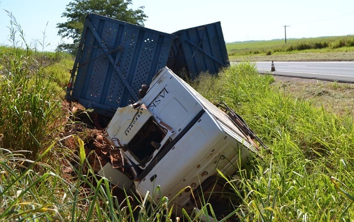 CONDUTOR TOMBA CAMINHÃO CANAVIEIRO EM BARRANCO ÀS MARGENS DE RODOVIA