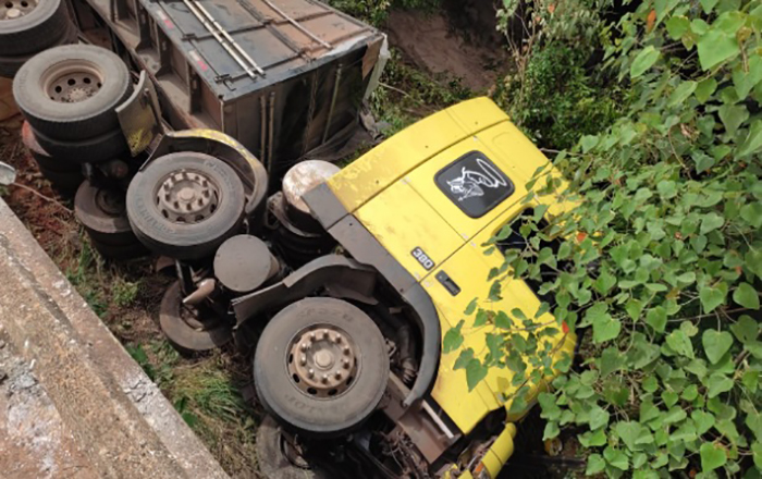 CAMINHÃO CARREGADO DE CIMENTO CAI DENTRO DE RIO NA SP-425