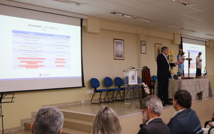 Em seguida, o Reitor do UniSALESIANO, padre Paulo Vendrame, deu as boas-vindas aos presentes e expressou sua emoção ao ver o auditório repleto após o recesso de julho: