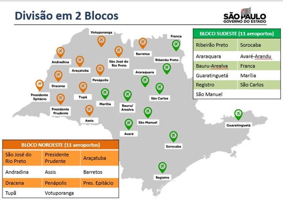 O Governo de São Paulo marcou para o dia 15 de julho, na sede da Bolsa de Valores na Capital, o leilão para concessão de 22 aeroportos regionais, atualmente administrados pelo Estado, com previsão de mais de R$ 447 milhões de investimento por parte da iniciativa privada. Os aeroportos estão divididos em dois blocos – Noroeste e Sudeste – e a concessão terá prazo de 30 anos. A documentação completa da concessão está disponível no site da Artesp.