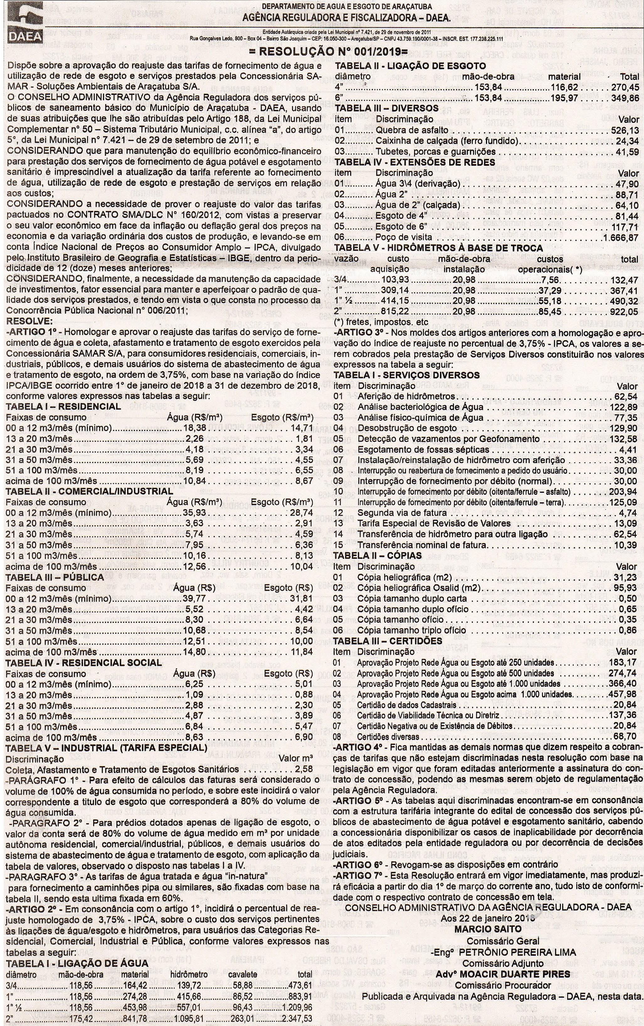 De acordo com a resolução publicada pela agência, o percentual de 3,75% é aplicado para todos os 72 tipos de serviços que podem ser prestados pela Samar, entre eles as tarifas comuns cobradas da população, inclusive as de cunho social. A medida entra em vigor de imediato, porém será observada pela população nas cobranças geradas a partir de 1º de março de 2019.