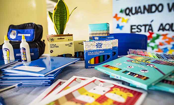 Os kits de material escolar contêm apontador com depósito; borracha; caderno brochura grande; caderno brochura pequeno; caderno de desenho; caixa de cola colorida; caixa de cola com glitter; caixa de giz de cera; caixa de lápis de cor contendo 24 lápis; massa de modelar; canetas azul e vermelha; cola branca; lápis grafite sextavado; estojo de canetinhas; estojo escolar; pasta poliondas; pincel; régua transparente; papel sulfite; tinta aquarela em pastilha com 12 cores; tesoura e tela branca (para o primeiro ano).