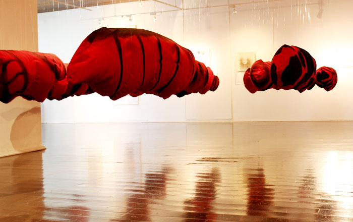 A referência é da exposição “Do outro lado do vidro vejo paisagens alheias", realizada em 2019, no Centro Cultural Brasil-Moçambique, em Maputo, Moçambique, onde as peças que compunham as obras, como colchões, toalhas, sacolas e cobertores, doados à população local após o final da exposição. Em Araçatuba as obras também lidam com essa possibilidade.