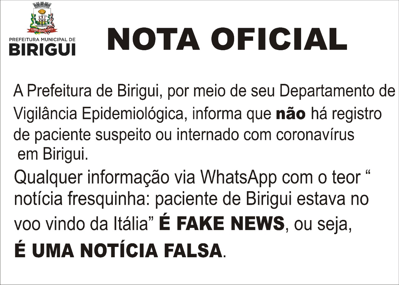 A Prefeitura de Birigui optou por tratar como "FAKE NEWS" o caso do paciente que procurou os serviços públicos de Saúde com sintomas de gripe, após chegar de viagem da Itália, país onde há uma recorrência de casos do novo coronavírus.