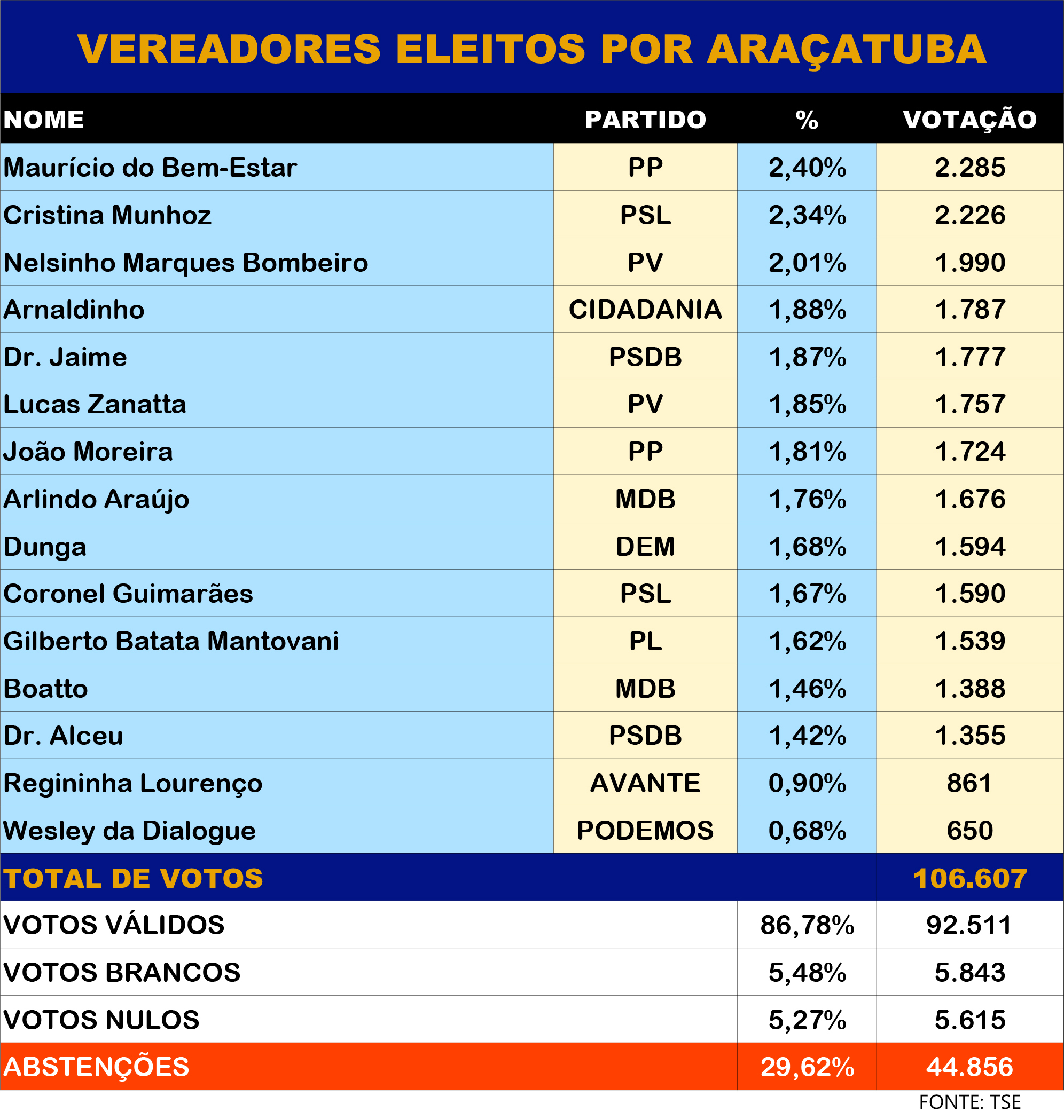 As demais novidades na futura Câmara de Araçatuba serão Nelsinho Marques Bombeiro (PV), Arnaldinho (Cidadania), Coronel Guimarães (PSL), Boatto (MDB) e Wesley da Dialogue (Podemos). Os reeleitos para novos mandatos são os parlamentares D. Jaime (PSDB), Lucas Zanatta (PV), Arlindo Araújo (MDB), Dunga (DEM), Gilberto Batata Mantovani (PL) e Dr. Alceu (PSDB).