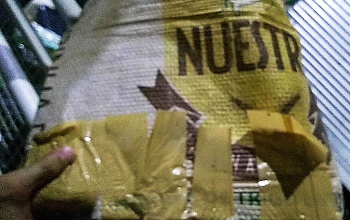 Após os Bombeiros cortarem a fuselagem do baú, os policiais encontraram uma grande quantidade de droga embalada em sacos de farinha de trigo industrial com uma outra logomarca. Do moinho Capici, da marca Nuestra, empresa localizada na cidade de Nueva Esperanza, no Paraguai.
