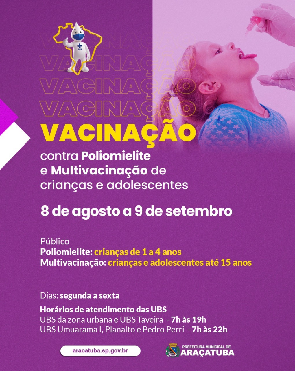 A Secretaria Municipal de Saúde de Araçatuba fará, a partir da próxima segunda-feira (08), até o dia 9 de setembro, vacinação para crianças e adolescentes. A ação faz parte da Campanha Nacional de Vacinação contra a Poliomielite e da Multivacinação, do Ministério da Saúde.