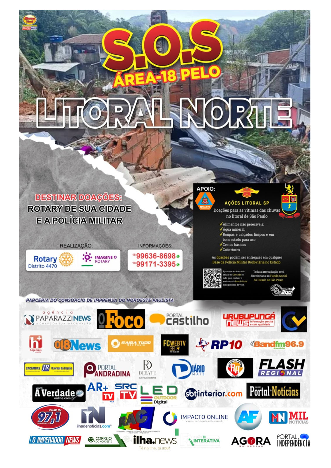 Uma ação humanitária denominada SOS Área - 18 está envolvendo diversos veículos de imprensa da região noroeste paulista Araçatuba (SP), Rotary Distrito 4.470, Polícia Militar, Polícia Militar Rodoviária e Defesa Civil, estão buscando arrecadação de gêneros alimentícios, água mineral, materiais de higiene e outros itens para serem destinados às vítimas da enchente que vem castigando o litoral norte paulista desde o último domingo (19). O portal de notícias www.018news.com.br é parceiro da iniciativa.