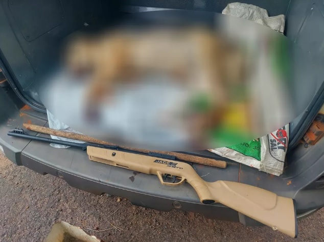 No local, foram apreendidos uma espingarda carabina de pressão de 5.5 milímetros, uma pá de lixo com cabo de madeira e um pote de chumbinhos para arma de pressão. Também de acordo com a corporação, esses materiais foram utilizados para matar a cadela.