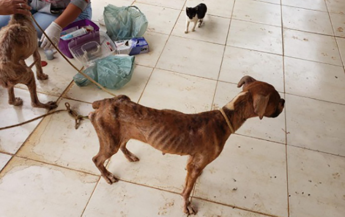 Os dois cães – um sem raça definida e um boxer - , foram localizados no fundo do quintal, num ambiente cheio de fezes e com muito mau cheiro. Ambos estavam magros e apresentavam ferimentos pelo corpo.