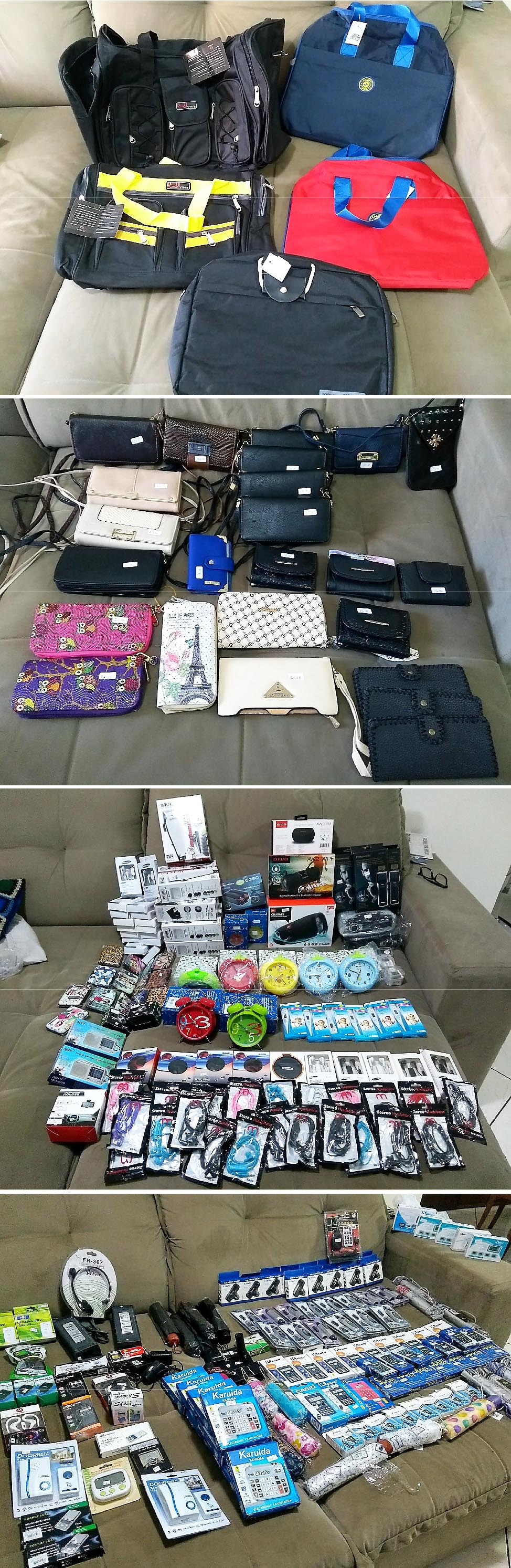 6) VARIEDADES - materiais de som, sombrinhas, máquinas de cortar cabelo, barbeadores elétricos, carregadores de celular, fones de ouvido, relógios de mesa e termômetros digitais.