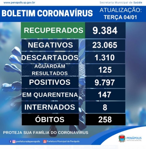 Mais 11 moradores foram diagnosticados com o vírus por meio de exames, passando a quantidade de 9.786 para 9.797. Do total, oito estão internados, 147 permanecem em quarentena e 9.384 se recuperaram. Desde o começo da pandemia, 258 pessoas - 148 homens e 110 mulheres – não resistiram às complicações e vieram a óbito.