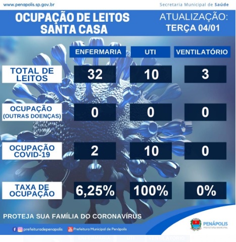 Os leitos de UTI (Unidade de Terapia Intensiva), destinados apenas para casos da Covid-19, o novo coronavírus, na Santa Casa de Penápolis, atingiram 100% de ocupação nesta terça-feira (04), conforme boletim epidemiológico da secretaria de Saúde.