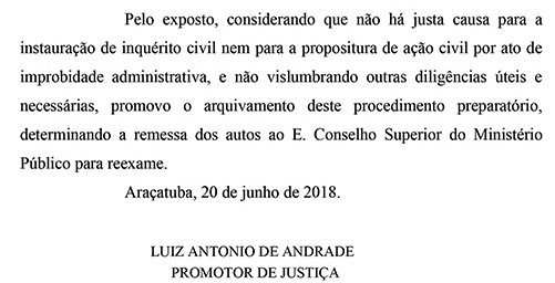 Ao proferir a decisão pelo arquivamento do caso, o promotor se amparou em informações prestadas pela administração municipal conforme solicitação sua. Não consta no documento assinado por Andrade se ele chegou a requisitar da Prefeitura de Araçatuba uma cópia dos kits de livros, dicionários e jogos que foram comprados, para uma análise mais aprofundada do conteúdo pela própria promotoria.