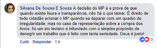 Já a secretária Silva de Sousa e Souza se manifestou no Facebook. “A decisão do MP é a prova de que quando existe lisura e transparência, não há o que temer. É direito de todo cidadão acionar o MP quando se deparar com um quadro de irregularidade, mas no caso da representação sobre a compra dos livros, foi um ato leviano e infundado com o simples propósito de denegrir um trabalho que é feito com tanta seriedade. Deus é justo”, disse.