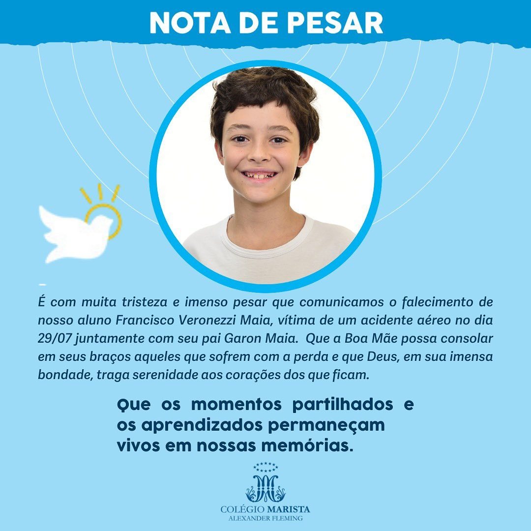 O Colégio Marista Alexander Fleming, de Campo Grande (MS), divulgou nota de pesar pela morte do menino Francisco Veronezzi Maia, aluno da instituição de ensino em suas redes sociais.