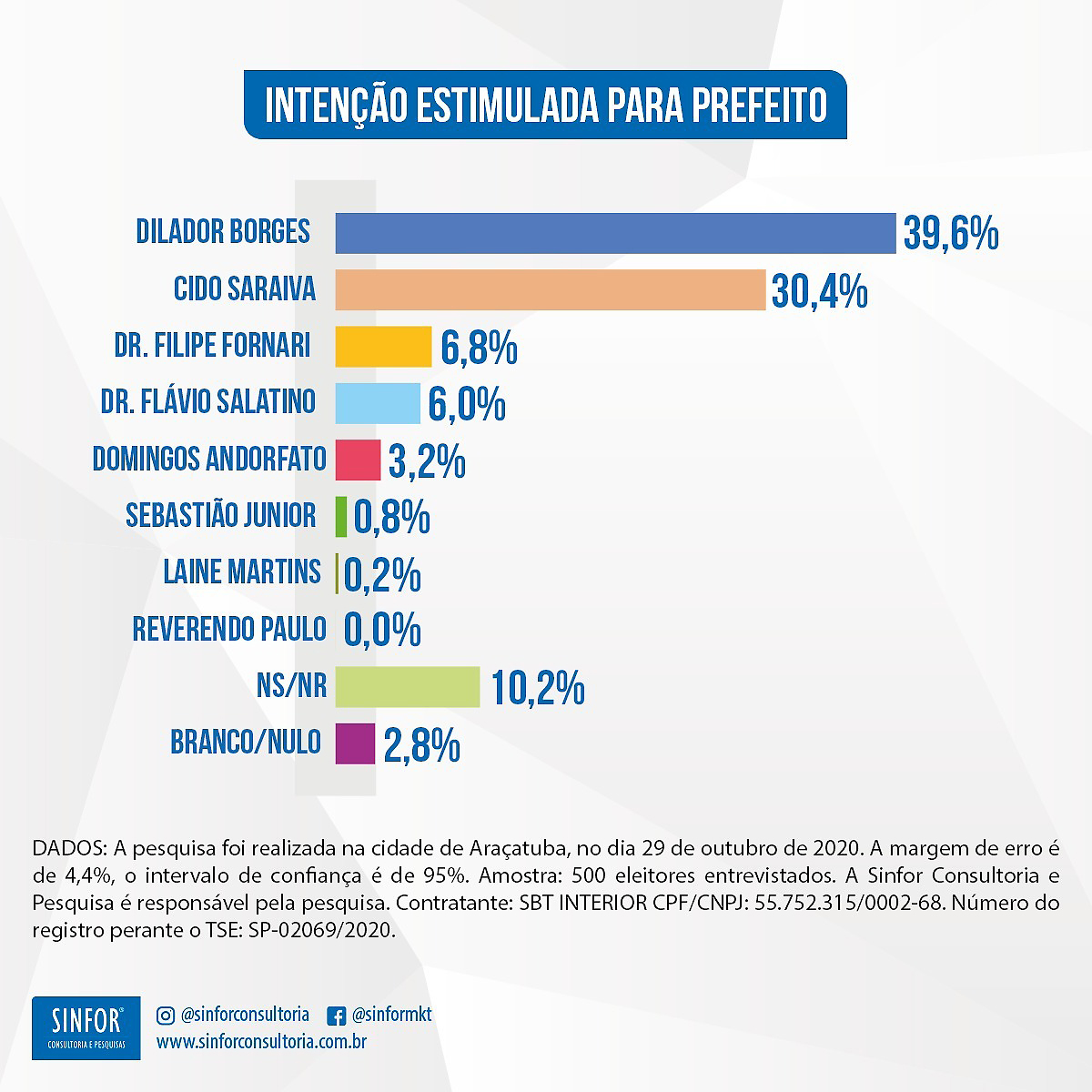A pesquisa realizada pela Sinfor Consultoria e Pesquisa e divulgada nesta terça-feira (3), encomendada pelo SBT no interior, para o cargo de prefeito em Araçatuba, apontou que o candidato à reeleição, Dilador Borges, do PSDB, é quem lidera as intenções de voto para ser o chefe do Executivo da cidade.