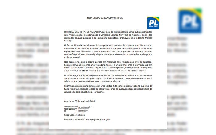 O diretório municipal do Partido Liberal (PL) de Araçatuba divulgou, no final da tarde desta quarta-feira (7), uma nota oficial em apoio à vereadora Solange Nery, conhecida como Sol do Autismo. No documento, assinado pela presidência da legenda, o partido manifesta solidariedade à parlamentar diante do que descreve como "reiterados ataques pessoais" promovidos pelo radialista Marcos Serelepe.