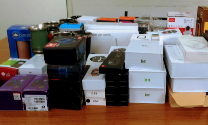Foram apreendidas duas câmeras de monitoramento; duas garrafas de whisky; dois roteadores; dois minigames; 56 telefones celulares; quatro tablets; 36 conversores TV Box; 53 relógios digitais; 16 copos Stanley; três máquinas de choque portátil.