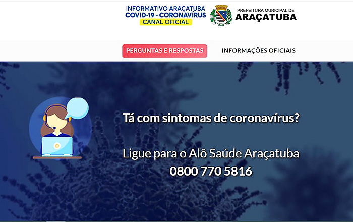 Através do link https://aracatuba.sp.gov.br/coronavirus será possível consultar informações oficiais sobre a situação do novo coronavírus em Araçatuba e o internauta terá acesso a uma aba no navegador com perguntas e respostas sobre a doença. O site já está em funcionamento.