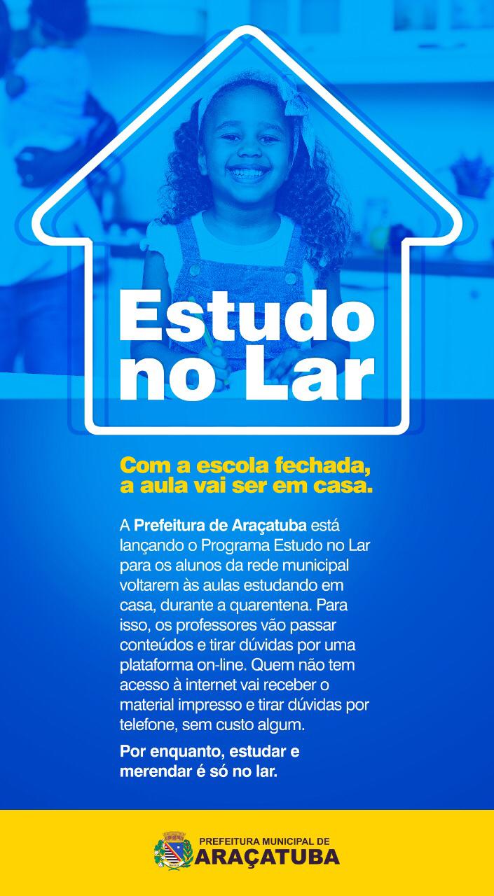 A Prefeitura de Araçatuba está lançando o Programa Estudo no Lar, para os alunos da rede municipal voltarem às aulas direto de suas casas, durante a quarentena em decorrência da pandemia de coronavírus.