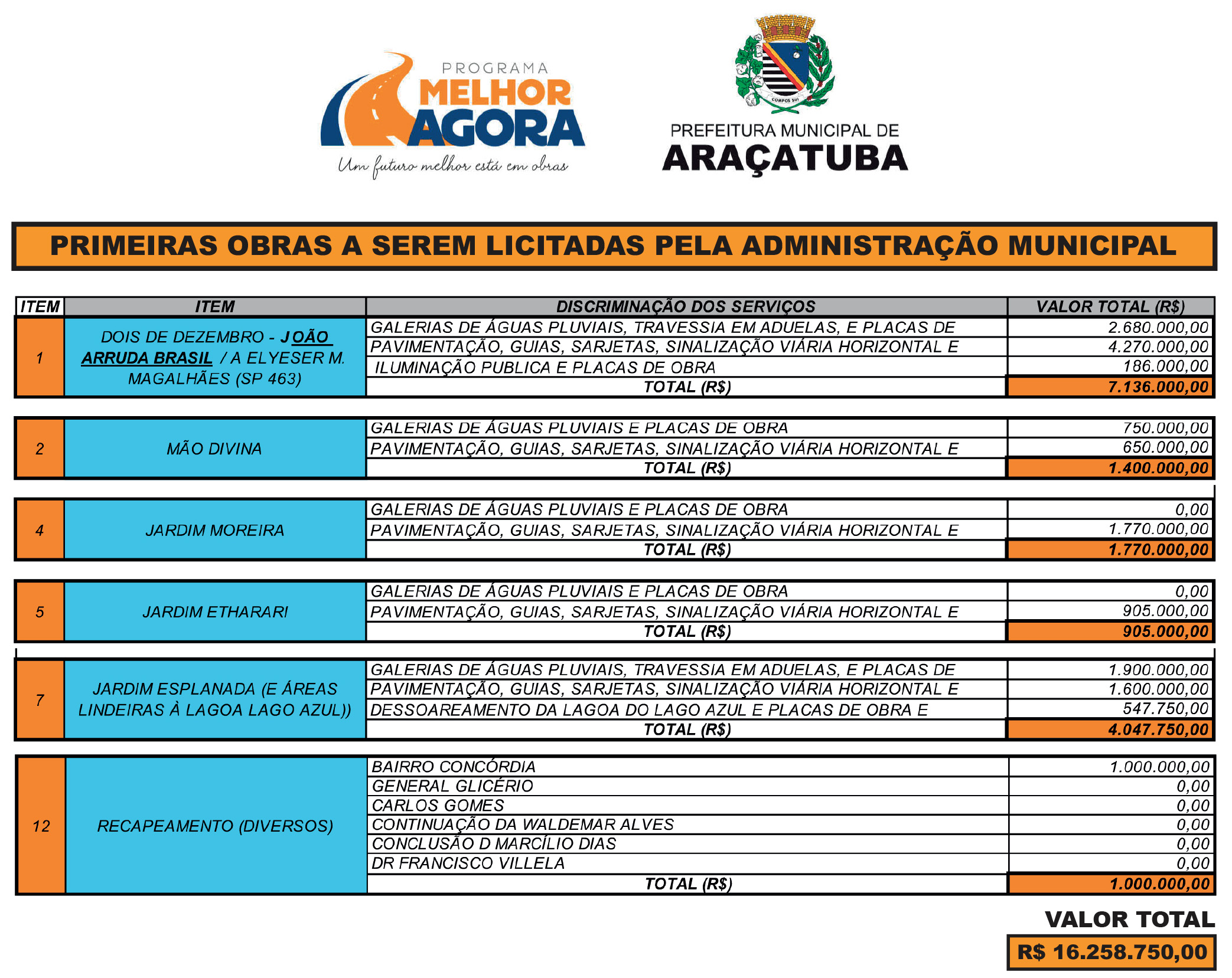 As seis primeiras licitações do pacote de 13 obras do programa "Melhor Agora", a ser custeado com R$ 26 milhões de financiamento assinado com a Caixa Econômica, terão seus editais para contratação de empresas publicados a partir desta semana, de acordo com a assessoria de imprensa da Prefeitura de Araçatuba.