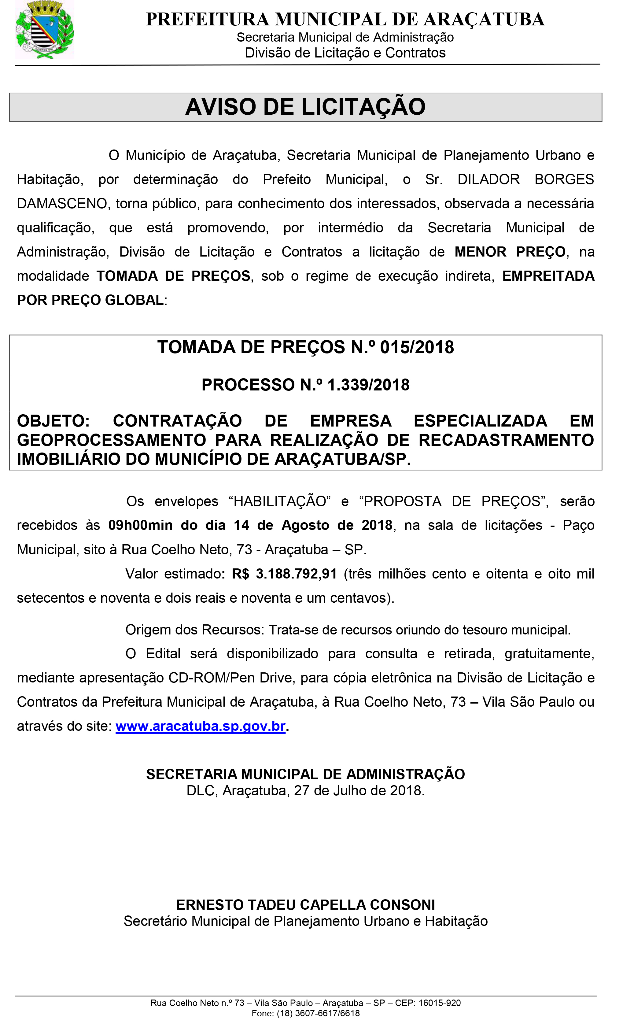 Em 27 de julho, a administração municipal publicou edital na modalidade Tomada de Preços onde estimava a contratação para o geoprocessamento em R$ 3.188.792,91. A intenção do governo municipal era abrir as propostas das empresas interessadas no dia 14 de agosto. O que não aconteceu por conta de correções determinadas pelo TCE-SP após questionamentos feitos pelo advogado Lindemberg Melo Gonçalves, que, mesmo sendo cego, conseguiu “enxergar” irregularidades no certame.
