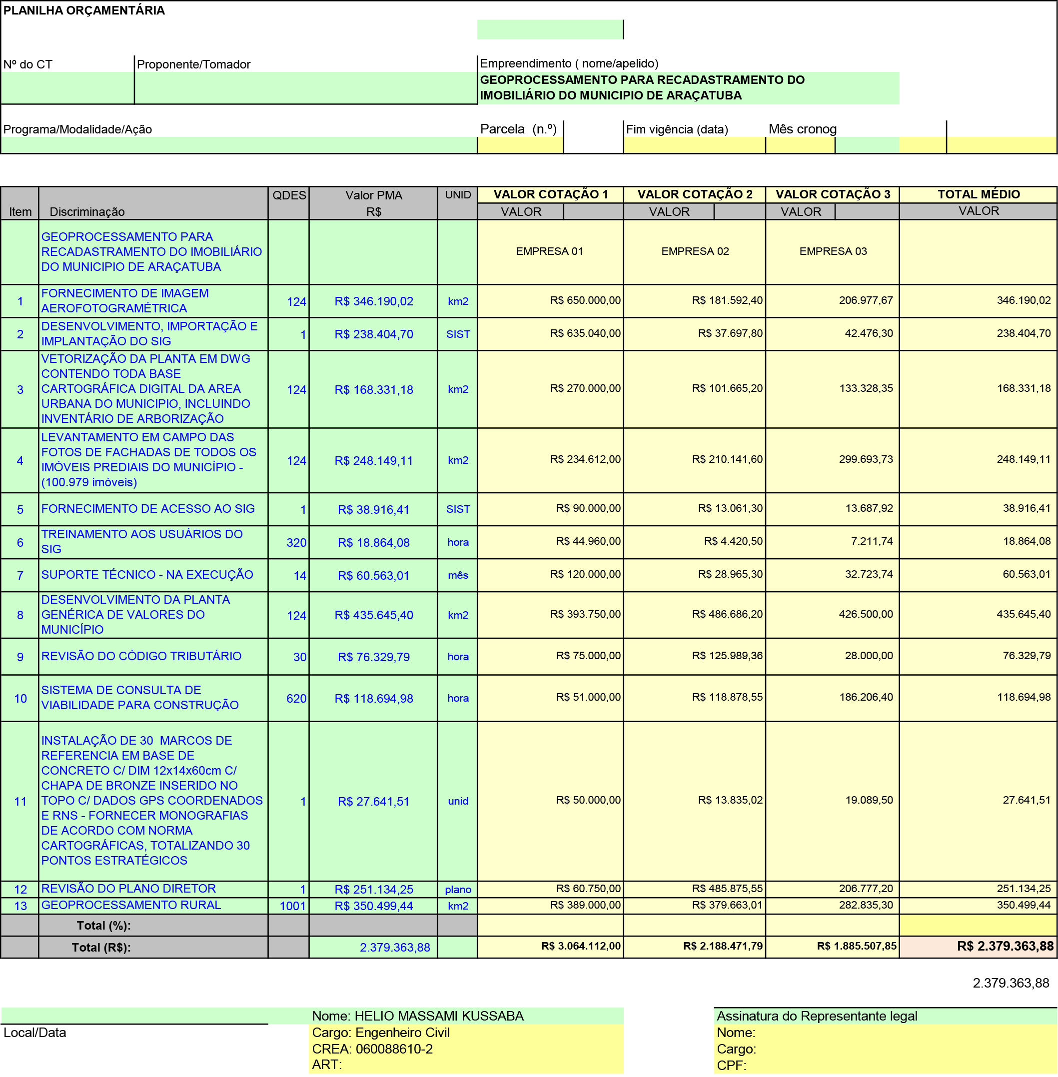 A Prefeitura, se utilizando dos três orçamentos, definiu um valor médio que pretendia gastar com a execução do geoprocessamento. No caso, R$ 2.379.363,88 conforme estabelecido no segundo edital publicado pela administração municipal.