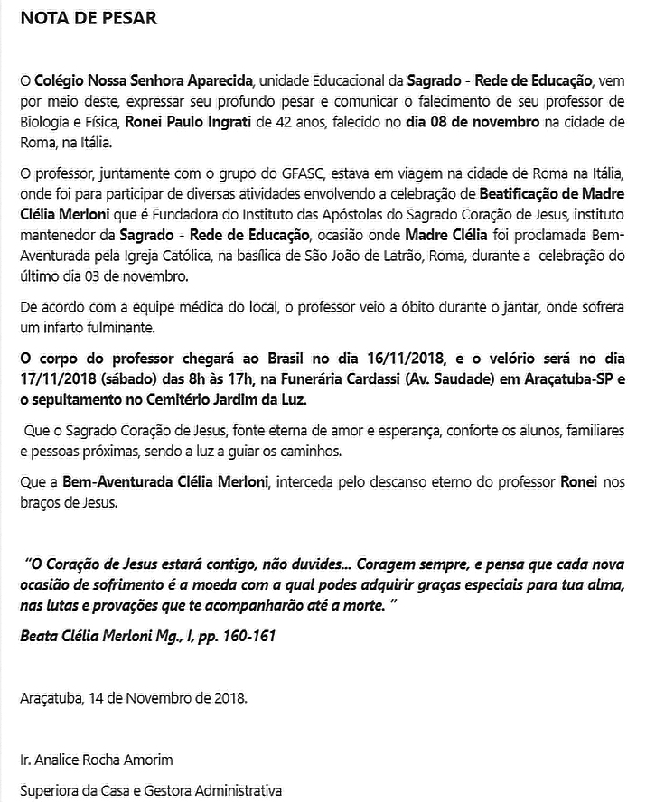 O professor estava na cidade italiana com um grupo de colegas de trabalho do colégio, participando das celebrações de beatificação da Madre Clélia Merloni, fundadora do Instituto das Apóstolas do Sagrado Coração de Jesus, mantenedor das escolas da rede existentes nos estados de São Paulo e Paraná.