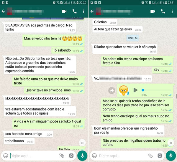 Nas mensagens, o radialista ainda fala sobre um possível interesse do líder comunitário e de seus amigos por cargos comissionados na administração municipal. “DILADOR AVISA aos pedintes de cargos. Não Tenho”, afirma o radialista, que é questionado.