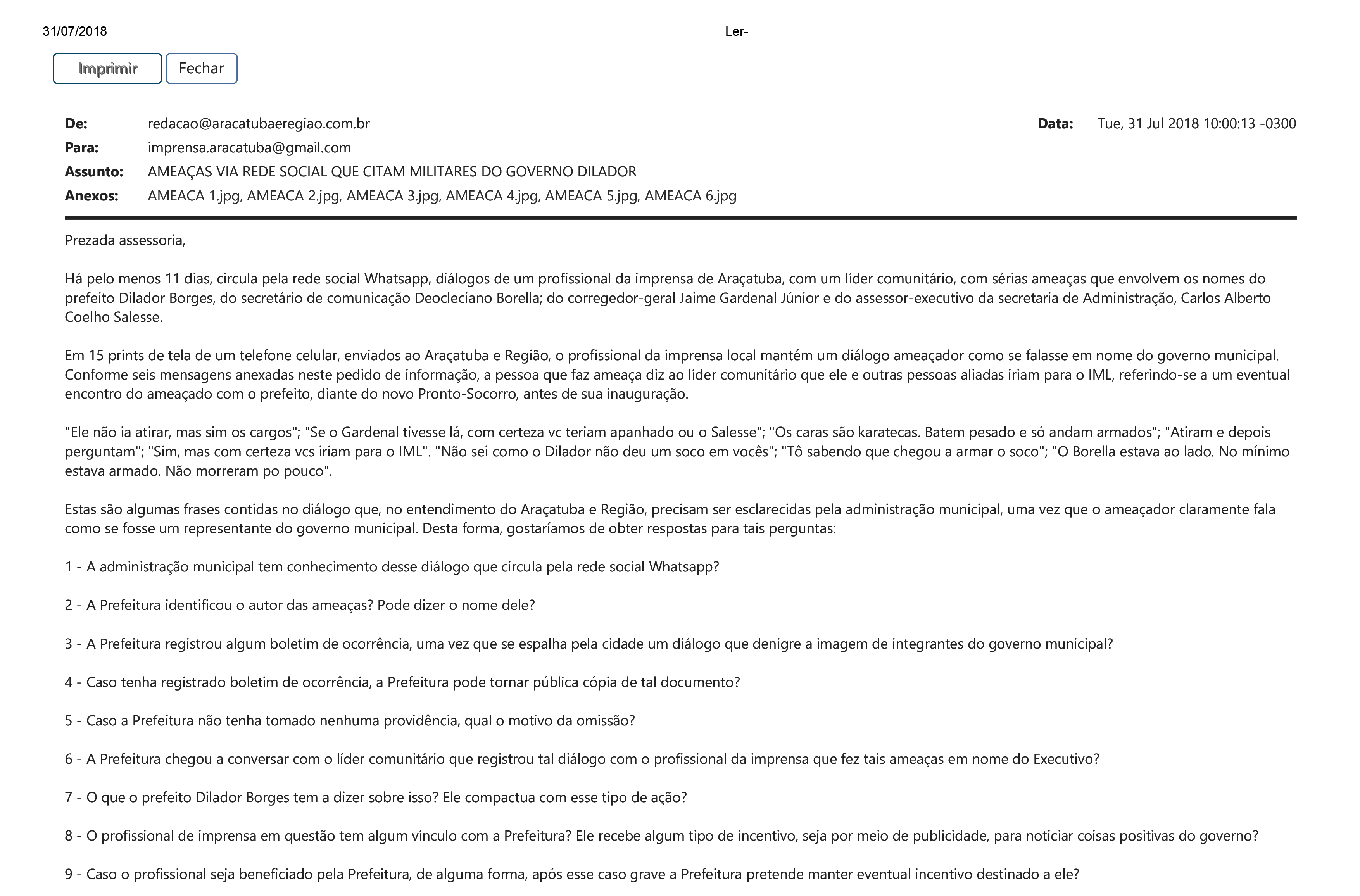 Da mesma forma, o Araçatuba e Região enviou questionário sobre o diálogo à assessoria de imprensa da Prefeitura. O pedido de informações foi feito por e-mail, às 10h desta terça-feira, 31 de julho de 2018. A Prefeitura, no entanto, não respondeu aos questionamentos até a conclusão desta reportagem.