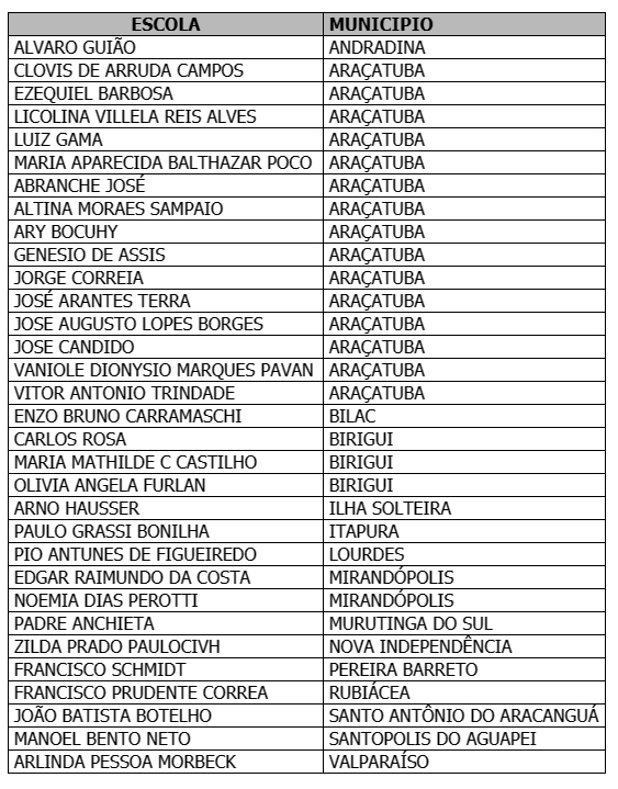 Na região serão atendidas escolas de Andradina (1), Araçatuba (15), Bilac (1), Birigui (3), Ilha Solteira (1), Itapura (1), Lourdes (1), Mirandópolis (2), Murutinga do Sul (1), Nova Independência (1), Pereira Barreto (1), Rubiácea (1), Santo Antônio do Aracanguá (1), Santópolis do Aguapeí (1) e Valparaíso (1).