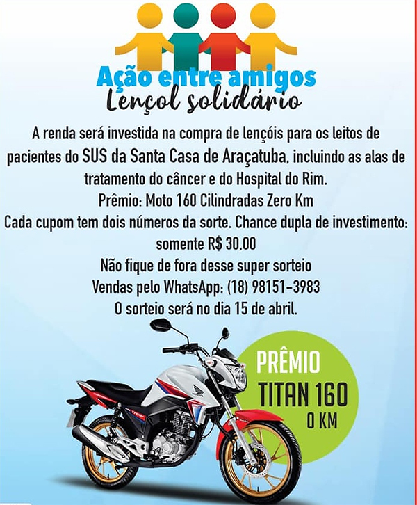 As pessoas que tiverem interesse em ajudar a Santa Casa em mais essa missão de solidariedade a amor ao próximo podem entrar em contato por meio do Whattsapp (18) 98151-3983. Para quem quiser ajudar comprando números da rifa do moto que será sorteada em 15 de abril, veja abaixo panfleto com as informações para aquisição de cupons.