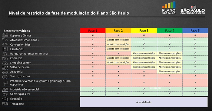 O governo de São Paulo divulgou, nesta quarta-feira (27), as regras que passam a valer a partir de 1º de junho no plano de retomada da economia e flexibilização de atividades durante a pandemia de Covid-19, o novo coronavírus, que atinge o Estado e todo o País.