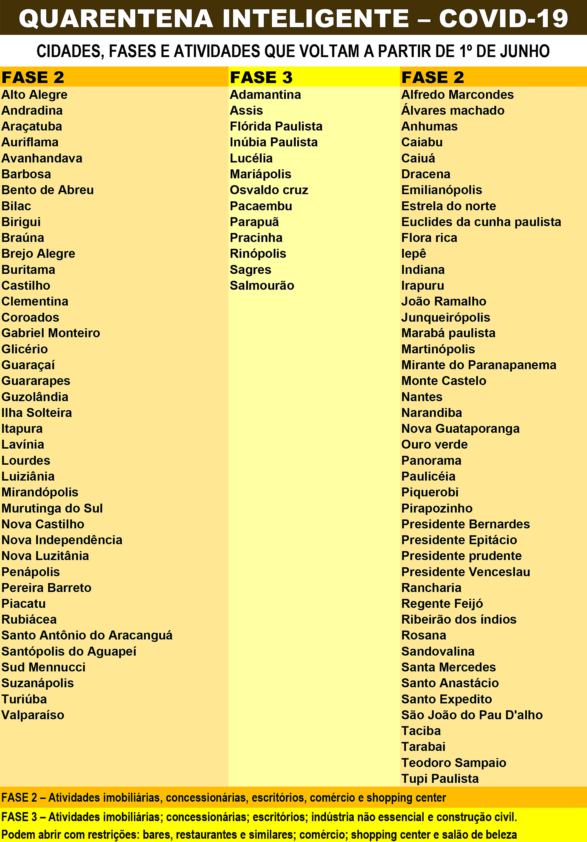Os municípios da área 018 de telefonia, que integram o DRS-2 e DRS-11, com sede em Araçatuba e presidente Prudente, se enquadram na fase 2, de cor laranja, e por conta disso poderão retomar determinadas atividades com restrições. São elas: atividades imobiliárias, concessionárias, escritórios, comércio e shopping center. Permaneçam fechados espaços públicos; academias; teatro e cinema; eventos que gerem aglomeração, inclusive esportivos.