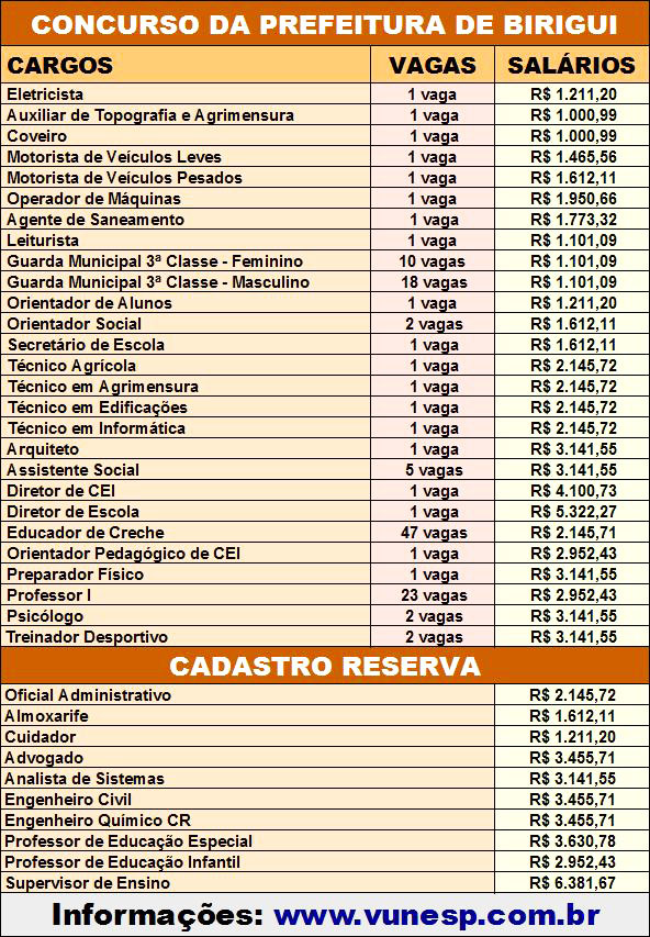Para mais informações, o edital completo está no Diário Oficial Eletrônico: https://dosp.com.br/exibe_do.php?i=NzAwMDE=VEJA RELAÇÃO DE CARGOS, VAGAS E SALÁRIOS DISPONÍVEIS:
