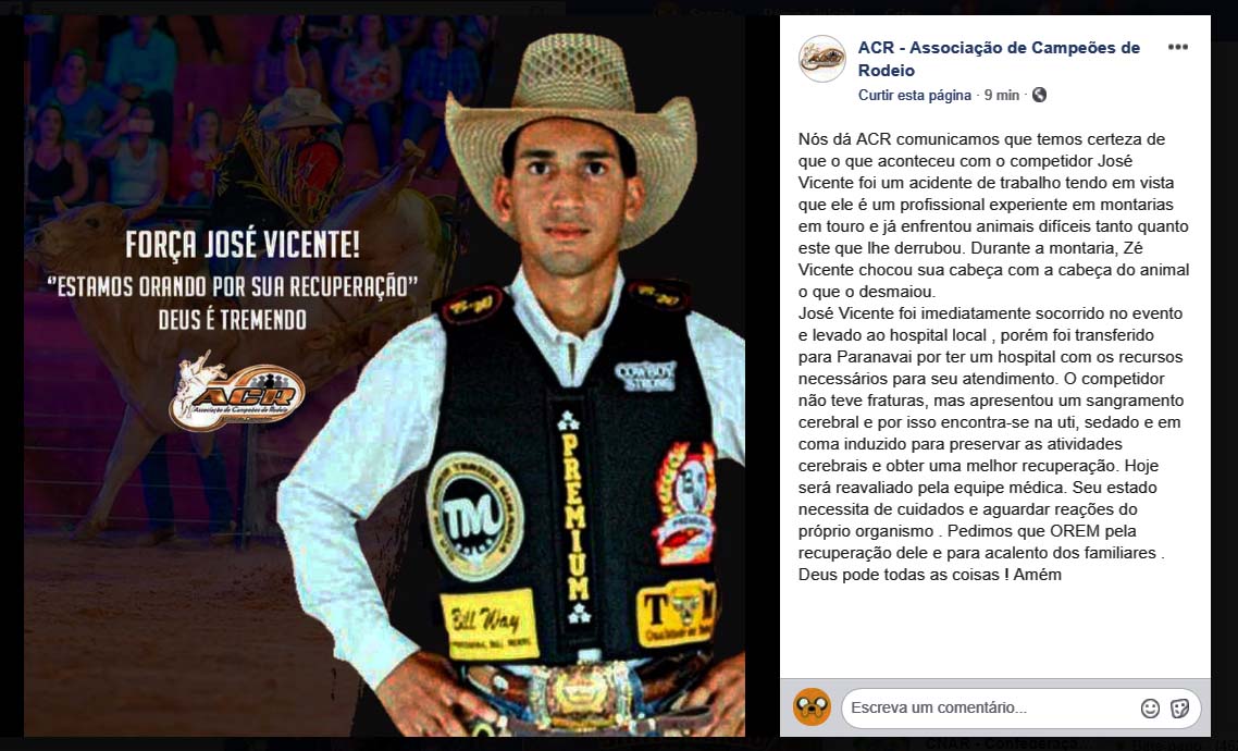 Na tarde deste sábado (17), dia da final da competição em Loanda (PR), a ACR publicou em sua página no Facebook uma nota na qual classifica o ocorrido como um acidente de trabalho. A associação também afirma que Zé Vicente é um peão experiente em montarias em touros “difíceis” como o animal Lacta, que o derrubou na última quinta-feira.