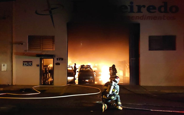Um incêndio destruiu seis veículos que estavam estacionados em um barracão, na rua Rubens Rego Fontão, no bairro Parque Industrial, em Araçatuba (SP), na madrugada desta segunda-feira (10).
