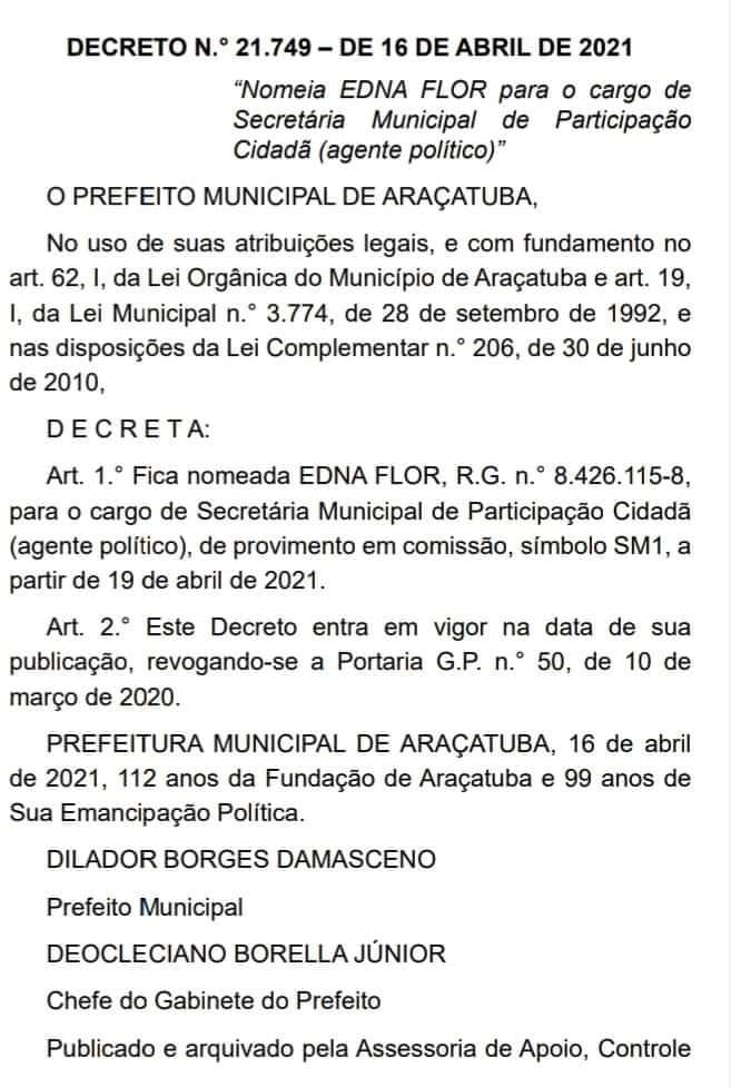 A vice-prefeita Edna Flor (Cidadania) é a mais nova secretária de Participação Cidadã de Araçatuba. A nomeação para a nova função foi publicada no Diário Oficial Eletrônico do município com data desta sexta-feira (16). O documento é assinado pelo prefeito Dilador Borges (PSDB) e pelo chefe de gabinete Deocleciano Borella Júnior.