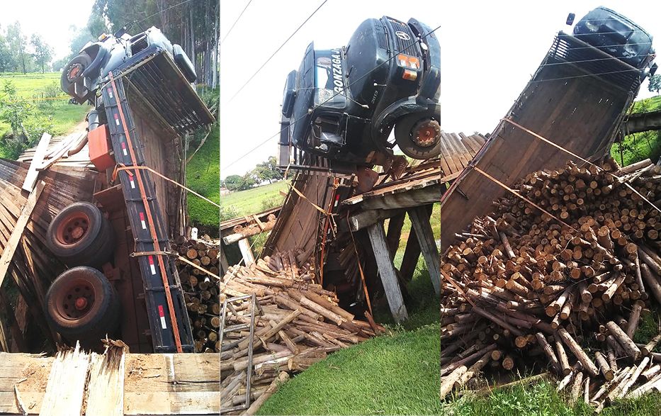Ponte de madeira quebra e caminhão carregado de eucalipto despenca