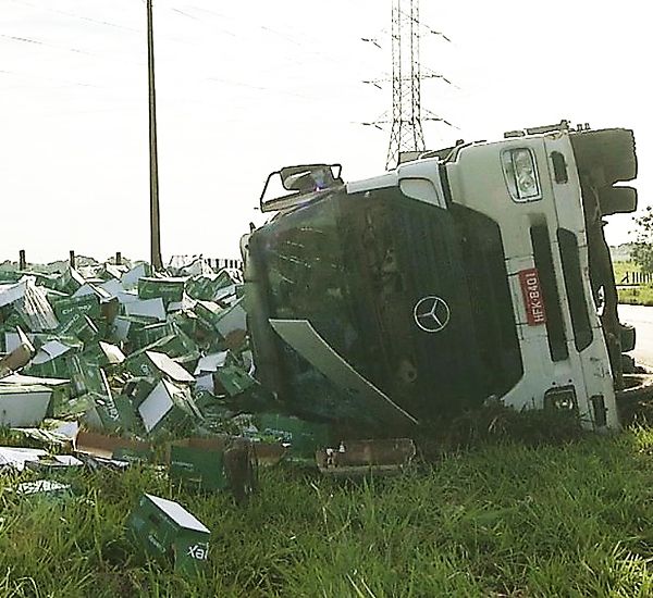 Caminhão carregado com caixas de papel sulfite tomba em rodovia