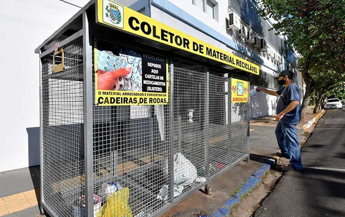 A estrutura pode receber cartelas vazias de comprimidos (blisters) e garrafas pet