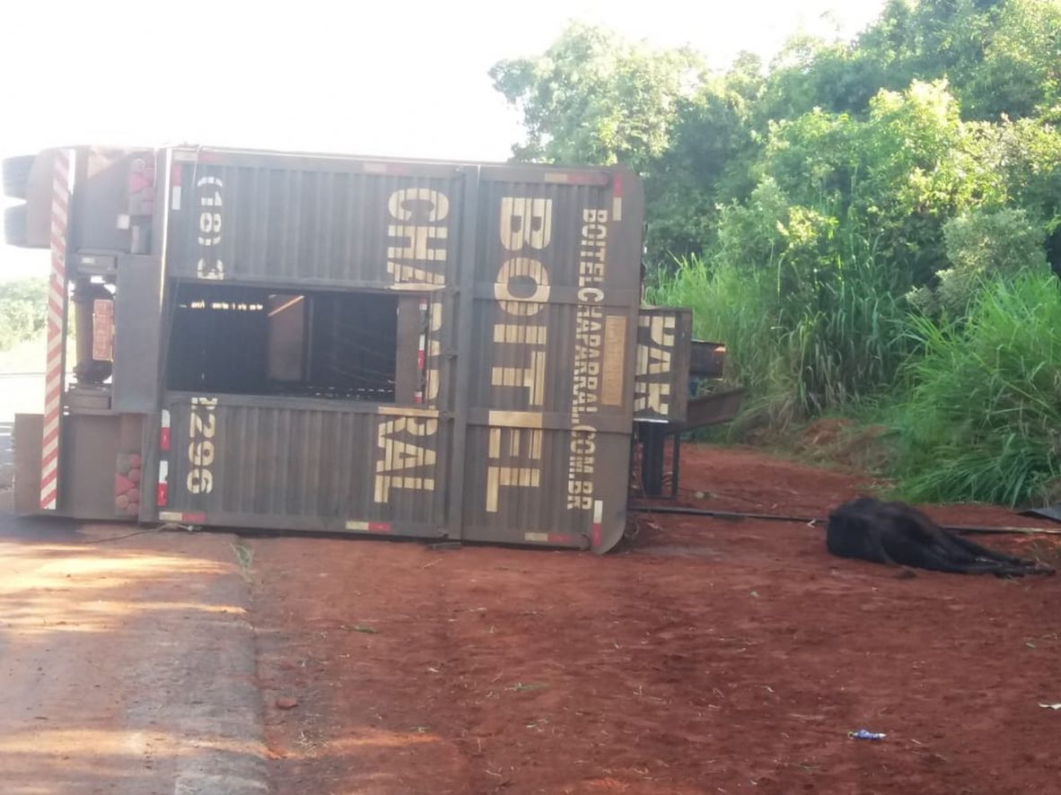 Carreta carregada com bois tomba em rodovia e cinco animais morrem