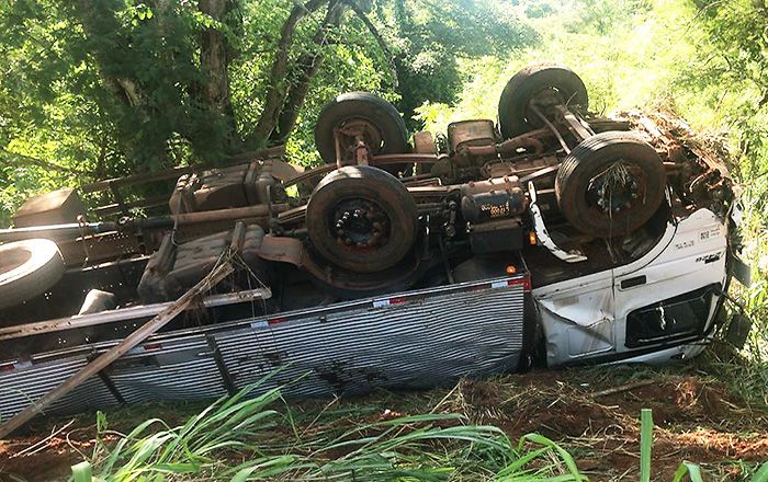 Caminhão carregado de ovo tomba próximo a ponte do rio Feio na SP-425