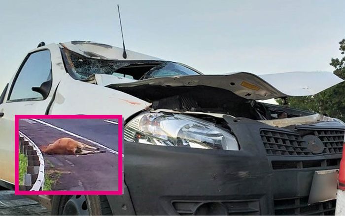 Acidente ocorreu durante a madrugada e impacto contra animal destruiu picape