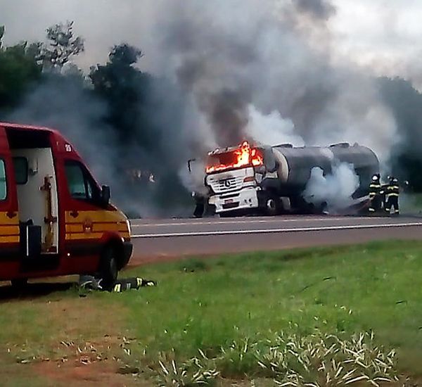 Caminhão-tanque carregado de sangue de boi pega fogo na rodovia SP-463