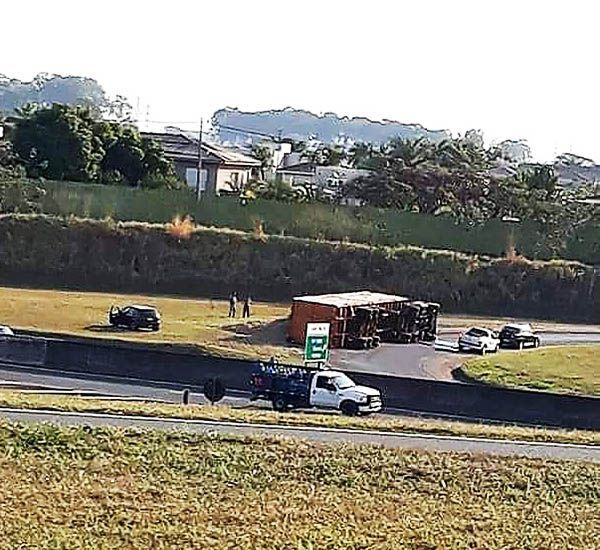 Carreta com bagaço de cana moído tomba em trevo de acesso à Rondon