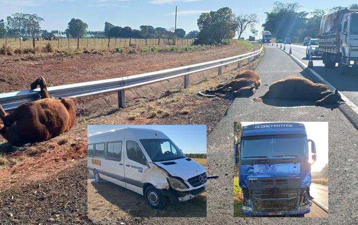 Uma van que passava no local não conseguiu frear a tempo e também colidiu contra os animais da raça Quarto de Milha na madrugada desta segunda-feira (7)