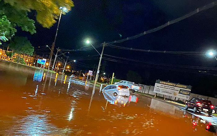 CARRO 'NAUFRAGA' EM ROTATÓRIA ALAGADA E VENTO DERRUBA MURO